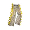 Upcycled pants, bleached with metal eyelets on the sides and neoprene bows, super trendy. 2000s vibes.